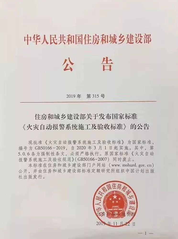 现批准《火灾自动报警系统施工及验收标准》为国家标准,编号为GB50166-2019,自2020年3月1日起实施。其中,第5.0.6条为强制性条文,必须严格执行。原国家标准《火灾自动报警系统施工及验收规范》(GB50166-2007)同时废止。